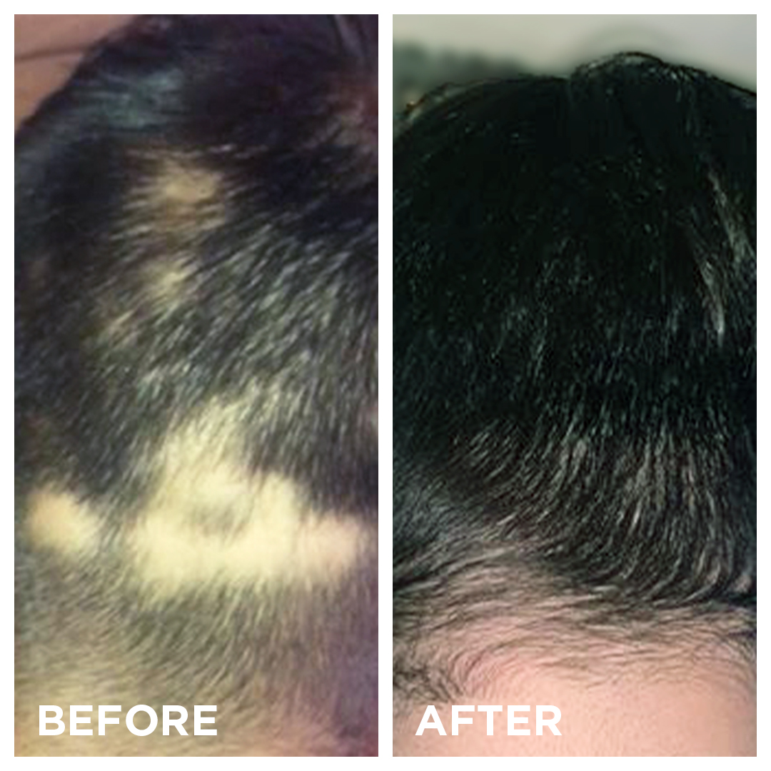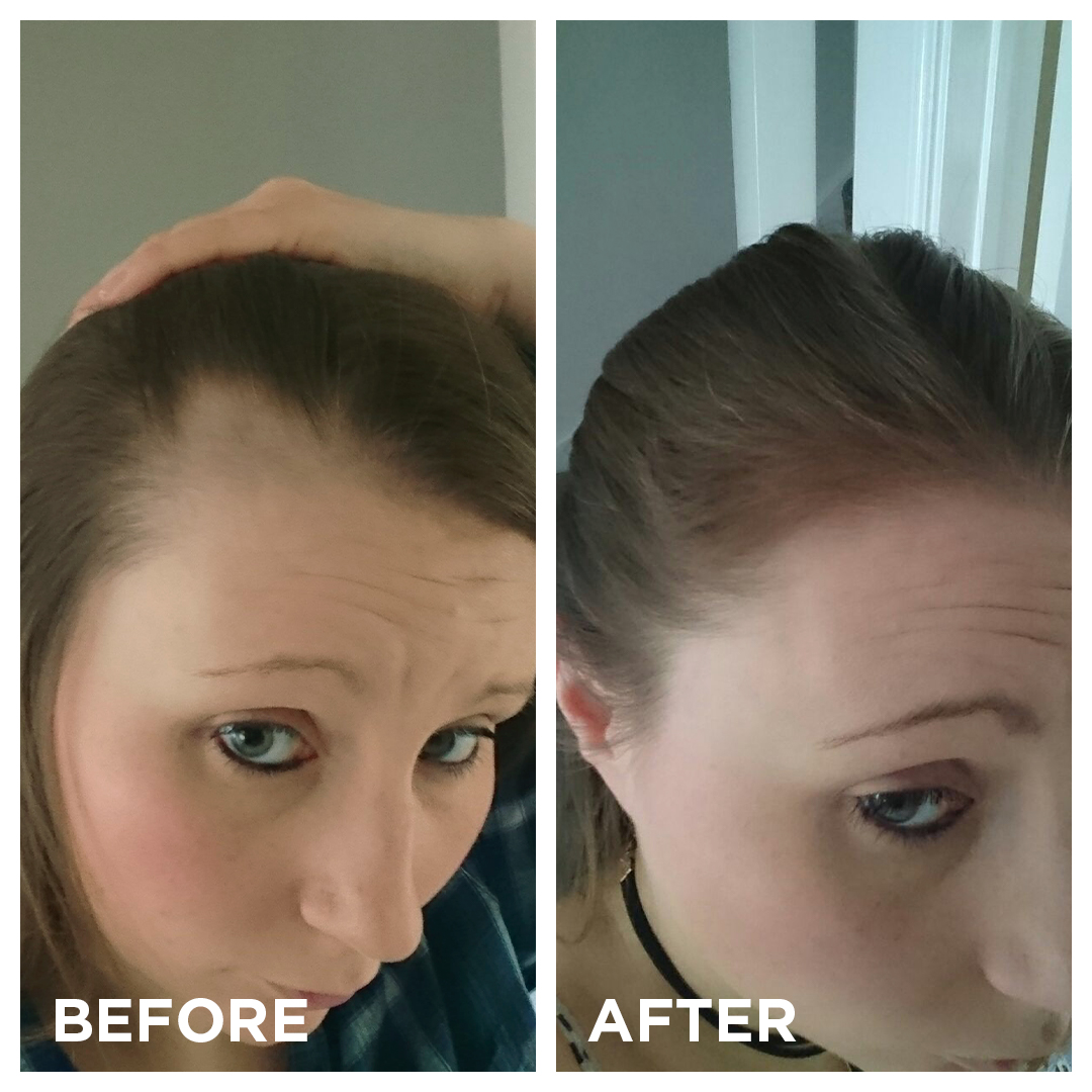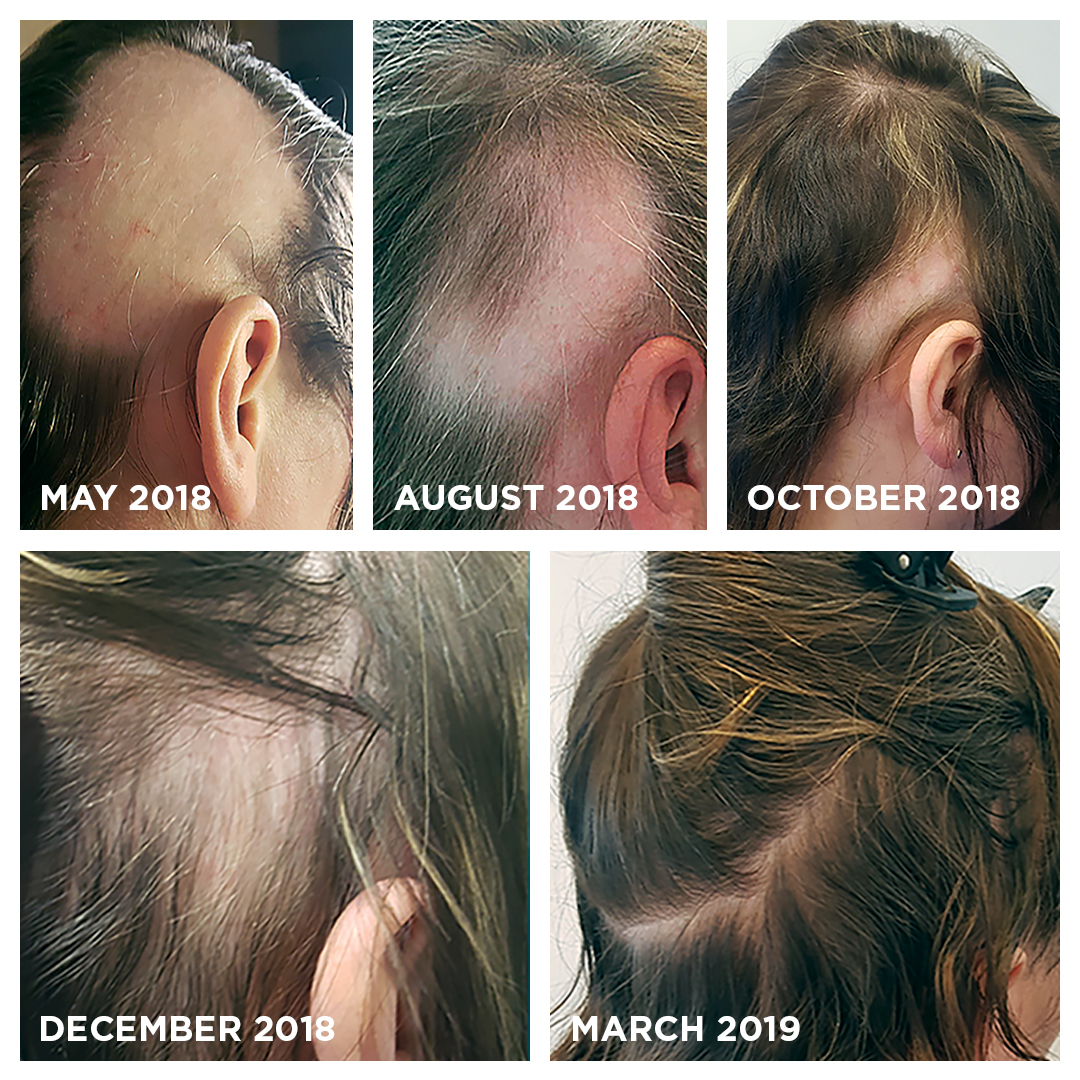 起初,我開始長出細細的胎毛,這些頭髮逐漸增多並變得更加結實,我最嚴重的禿頭斑塊已經幾乎完全被覆蓋。我極力推薦PRT+ Pro Formula。一開始當我意識到我的頭髮出現問題時,我感到非常崩潰,真的很擔心每個人都會盯著看我掉髮的地方。我會把頭髮放下來,這樣我就能稍微更好地掩蓋前方的斑塊,但這當然也意味著我的頭髮容易被我兒子抓住並拉扯。作為一個新手母親,我已經有太多的事情需要擔心了,還要擔心我的頭髮實在是太累人了,但現在我可以完全自信地將頭髮扎起來(遠離我的小男孩的攻擊範圍!)或放下來。